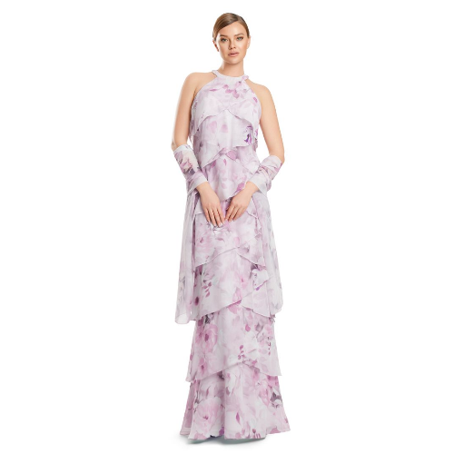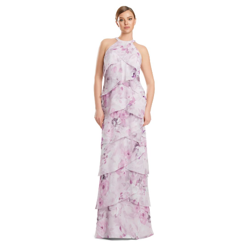 Elevate your evening with the captivating Alexander by Daymor style 3268 gown. This stunning printed chiffon creation features a tiered, cut-away silhouette that exudes graceful elegance.