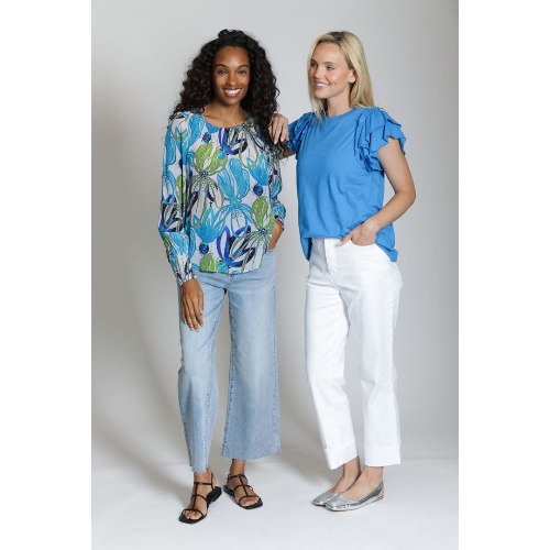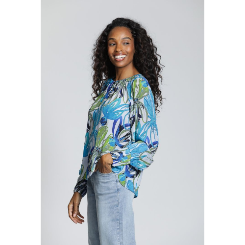 Bright, breezy, and effortlessly feminine, the APNY Pullover with Smocked Cuffs is the perfect top to add fresh color to your everyday wardrobe. Featuring a vibrant watercolor-inspired floral print in blues and greens, this lightweight blouse drapes beautifully with an easy, relaxed fit. The soft round neckline and subtle gathering add shape without feeling fussy, while the long sleeves finish with comfortable smocked cuffs for a touch of texture and a polished look. Pair it with denim, white pants, or linen for an instant outfit lift.
