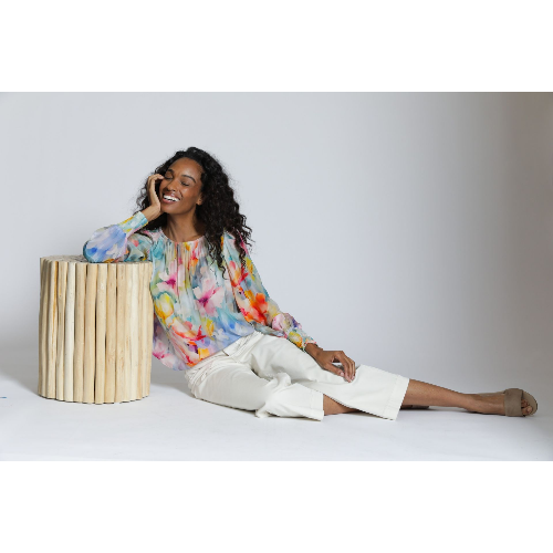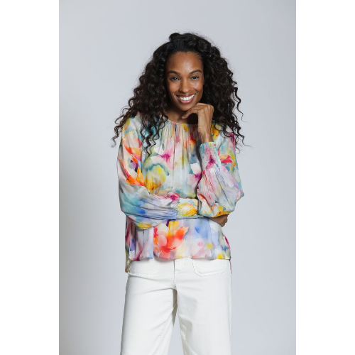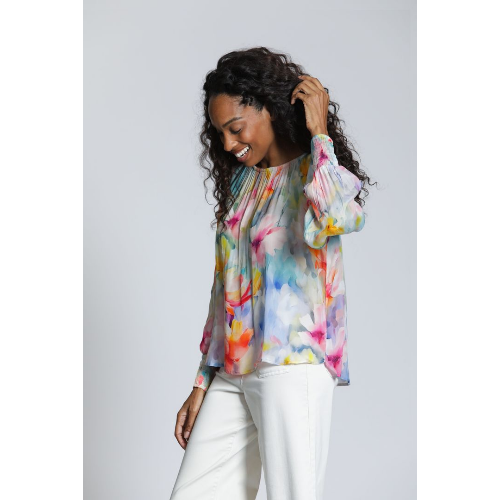 This APNY pullover top brings effortless elegance to everyday dressing with its soft, watercolor-inspired floral print. Designed with a gently gathered round neckline, it drapes beautifully for a relaxed yet polished silhouette. Long sleeves are finished with smocked cuffs, adding subtle texture and a comfortable, stay-put fit. Crafted from a lightweight, airy fabric, this blouse moves gracefully and layers easily, making it perfect for both casual days and elevated occasions. Pair it with denim for an easy daytime look or dress it up with tailored pants for a refined finish.