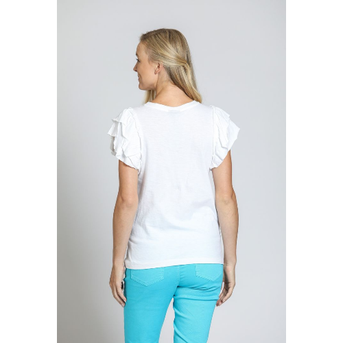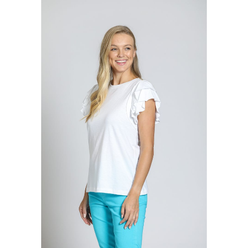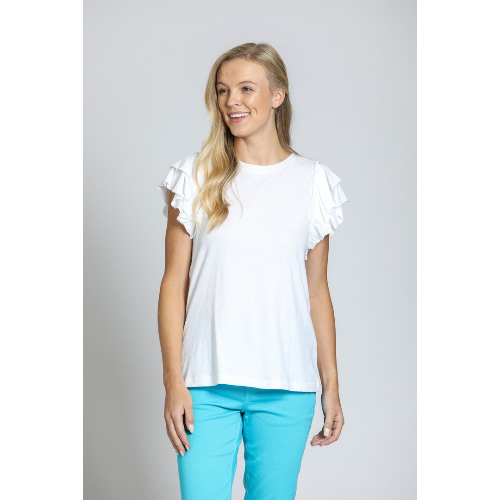 A fresh update to your everyday tee, the APNY Ruffle Cap Sleeve Tee blends casual comfort with feminine flair. Designed with soft layered ruffle cap sleeves, this easy knit top adds movement and charm while keeping a clean, classic silhouette. The lightweight fabric drapes beautifully, making it perfect for warm days or effortless layering. Pair it with printed shorts, denim, or trousers for an easy, polished look that works from day to night.