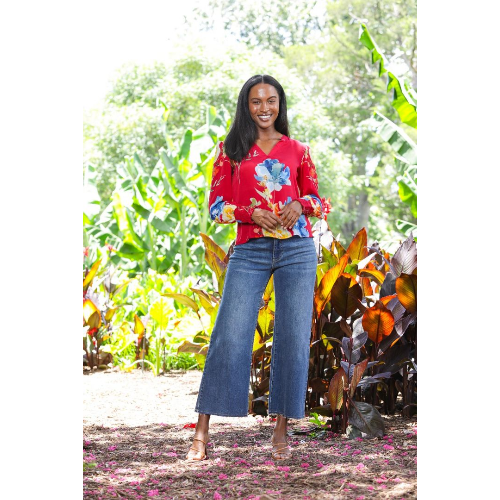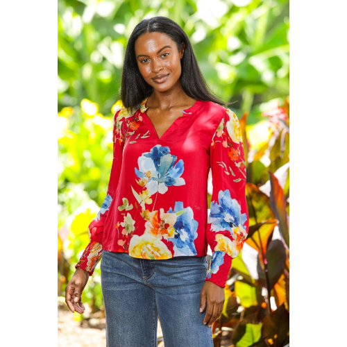 Brighten your day-to-night lineup with this statement floral blouse from APNY. Designed with a flattering split neckline and soft shoulder gathers, it features airy long sleeves finished with comfortable smocked cuffs for an easy, polished fit. The vivid watercolor florals pop against a rich red ground—perfect with denim for an elevated casual look or dressed up with tailored bottoms.