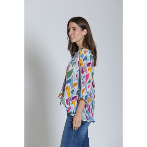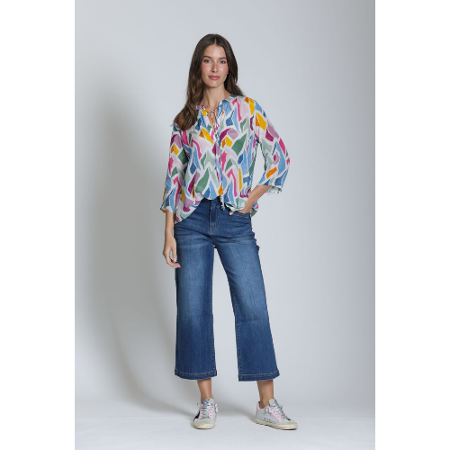 Breezy and artfully detailed, the APNY V-Neck Blouse with Tassel brings effortless charm to everyday dressing. Designed in a lightweight woven fabric, this relaxed top features a flattering split V-neckline finished with a delicate tassel tie for a touch of bohemian flair. The colorful abstract print adds vibrant personality, while the loose silhouette and three-quarter sleeves offer easy comfort and graceful movement. Perfect with denim, linen pants, or shorts, this blouse transitions seamlessly from casual days to polished outings.