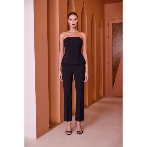 Sleek, minimal, and event-ready, this Carla Ruiz two-piece set pairs a strapless beaded top with tailored trousers for a polished evening look. The top features a clean straight neckline and elegant beaded detailing for subtle sparkle, while the matching trousers offer a streamlined, straight-leg silhouette that elongates the frame. Perfect for cocktail nights, weddings, and formal occasions when you want modern sophistication with an elevated finish.