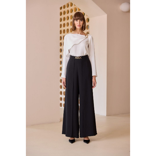 Polished and modern, this Carla Ruiz two-piece set pairs a fluid draped blouse with sleek, wide-leg trousers for an instantly elevated look. The blouse features an elegant asymmetric neckline with a soft overlay detail, finished with a gold-tone accent at the shoulder for a refined touch. High-waisted trousers create a long, flattering line and are completed with a statement gold belt at the waist. Wear together for effortless event dressing, or style each piece separately for endless versatility.