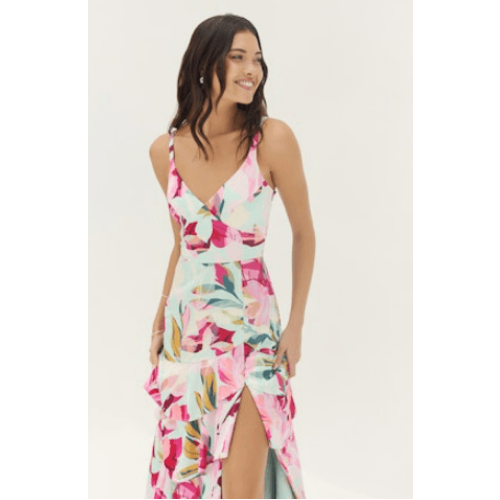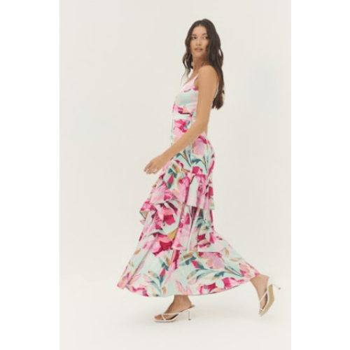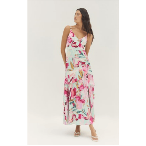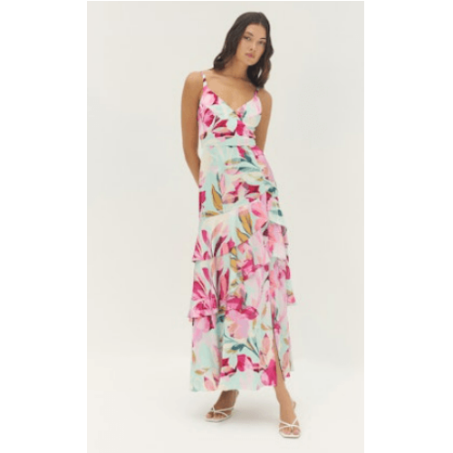 Turn heads in the effortlessly romantic Robina Dress by Hutch. Designed in a vibrant, tropical-inspired floral print, this dress brings movement and elegance to every step. The fitted bodice features a flattering V-neckline with delicate adjustable straps, flowing into a tiered skirt that creates soft volume and graceful drape.
