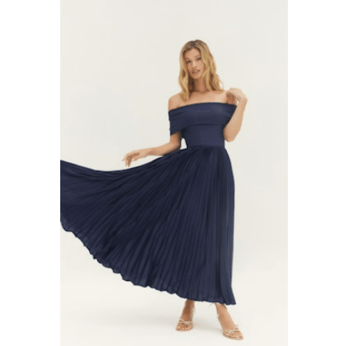 Timeless and refined, the Stockton Dress by Hutch is an elegant maxi designed for effortless sophistication. Featuring a chic off-the-shoulder neckline, this style highlights the collarbone while offering a flattering, secure fit through the bodice. The softly pleated skirt flows gracefully from the waist, creating beautiful movement and a polished silhouette.