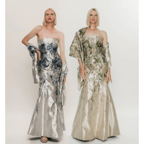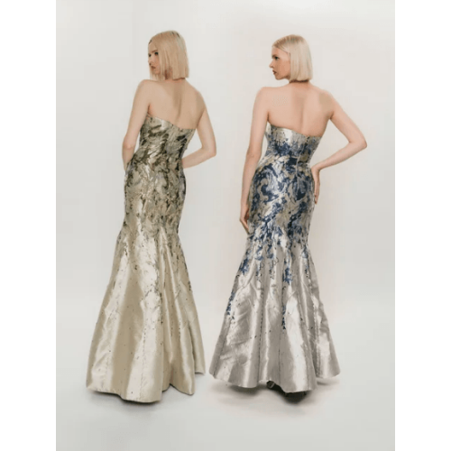 HYNES PARK ABSTRACT FLORAL BROCADE STRAPLESS GOWN WITH MATCHING STOLE