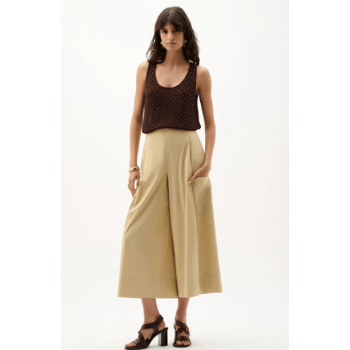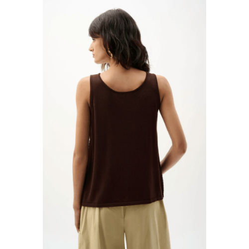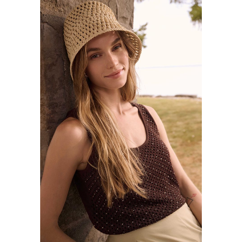 A straight-fit knit viscose-nylon camisole with an open-stitch design. Fully lined and adorned with allover iron-on stones on the front and a JR metal coin detail for subtle sparkle.