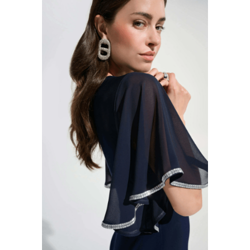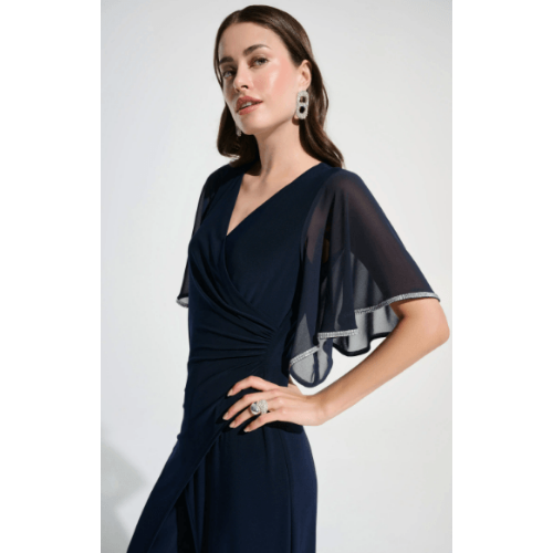 Silky knit and chiffon unite in this wide leg jumpsuit, styled with a wrapped bodice and flowing wrapped legs. Butterfly sleeves shimmer with rhinestone-trimmed hems, while a rhinestone puller zipper at the back adds a sparkling finish.
