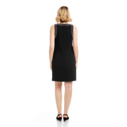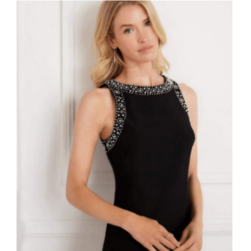 Turn heads in this elegant shift dress crafted from a soft crepe fabric that drapes beautifully. Designed with a sleeveless silhouette and a classic boat neckline, it is accented with exquisite bead embellishments around the neckline and armholes for a touch of glamour. Side bust darts provide a flattering shape, while the dress is fully lined for added comfort and a smooth fit. A concealed back zipper with hook-and-eye closure allows for easy wear, and the hem falls above the knee, creating a chic, timeless look perfect for cocktail parties or evening occasions.