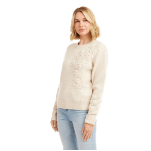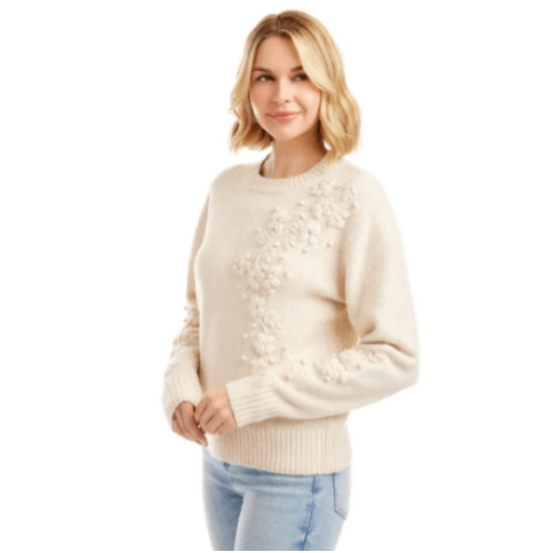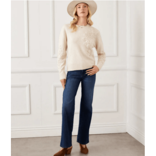 A timeless blend of comfort and elegance, this crew neck sweater is crafted with a minimal wool blend for a soft, cozy feel. Featuring delicate hand-embroidered floral details across the front and sleeves, it adds a feminine touch to a classic silhouette. Designed with set-in long sleeves, ribbed cuffs, and hem, this pull-on style pairs effortlessly with your favorite denim or skirts for a chic everyday look.