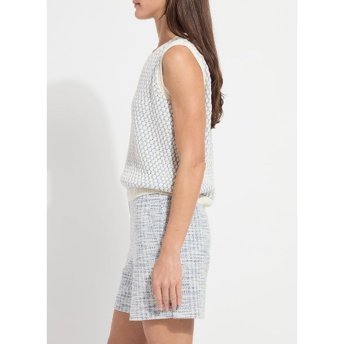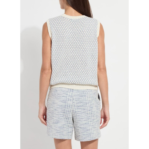 Meet your warm-weather sweater upgrade: the Lyssé Claire Textured Mesh Sweater Shell. Knit in an airy, dimensional pattern, this sleeveless pullover pairs a creamy base with soft sky-blue texture for an elevated, easy-to-style look. A classic crew neckline and clean armhole trim keep it polished, while the ribbed hem provides a flattering finish that looks great worn loose or half-tucked. Perfect layered under a blazer or worn on its own with denim, tailored shorts, or wide-leg pants for effortless, modern outfit-making.